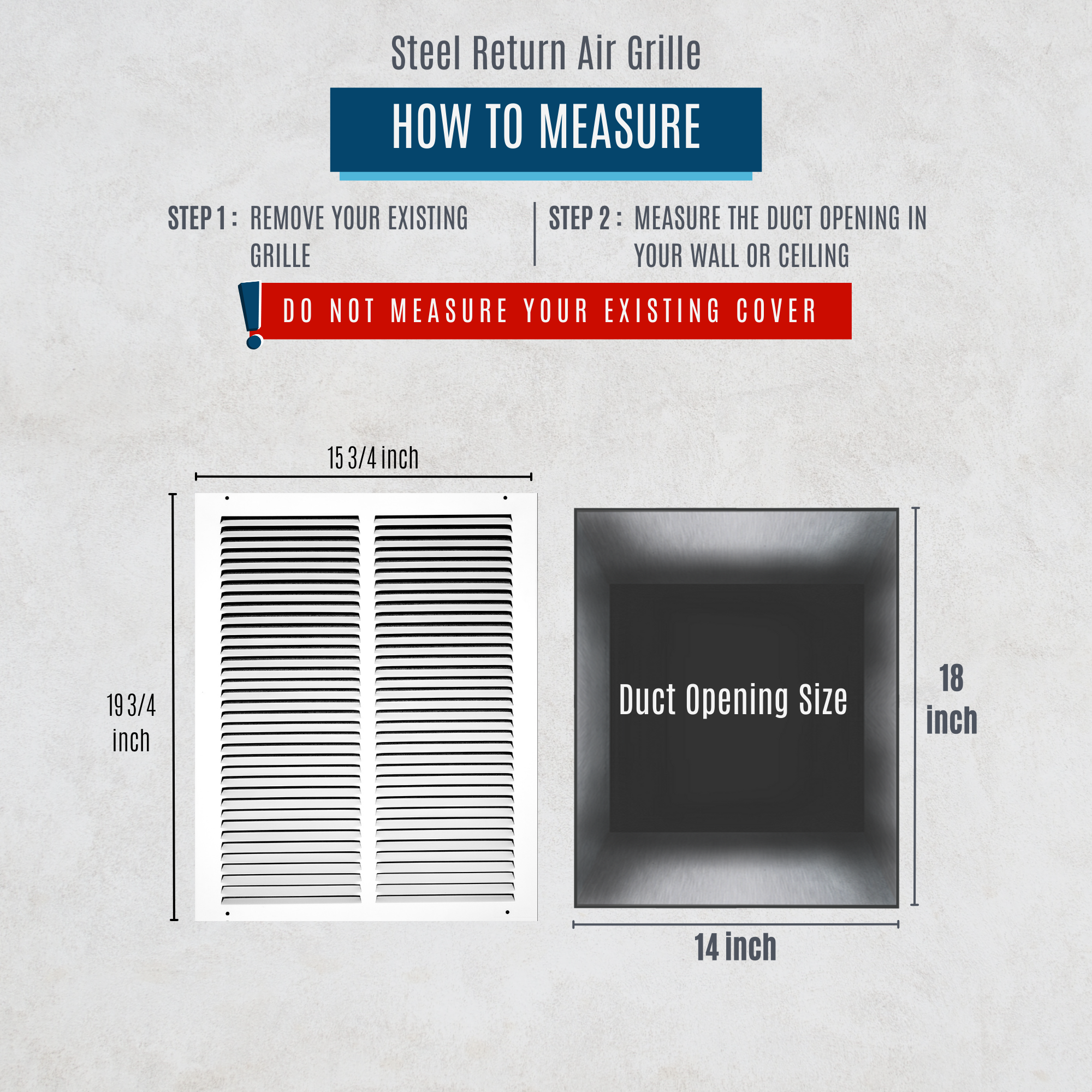 Always measure the size of the duct opening (the "hole" in the duct/wall). Do not measure the entire size of the register itself. Size of the grille is; listed size +1.75-inch.