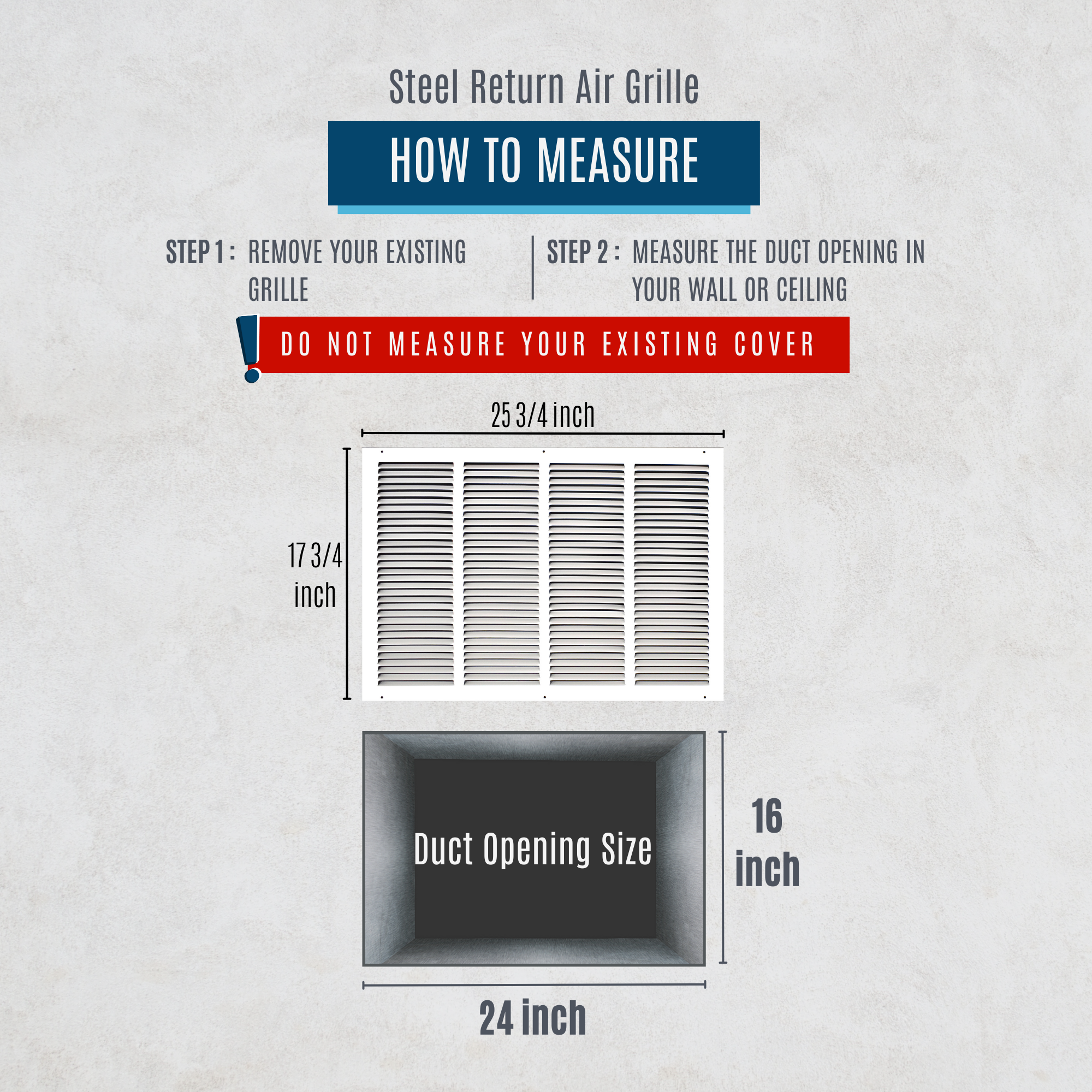 Always measure the size of the duct opening (the "hole" in the duct/wall). Do not measure the entire size of the register itself. Size of the grille is; listed size +1.75-inch.