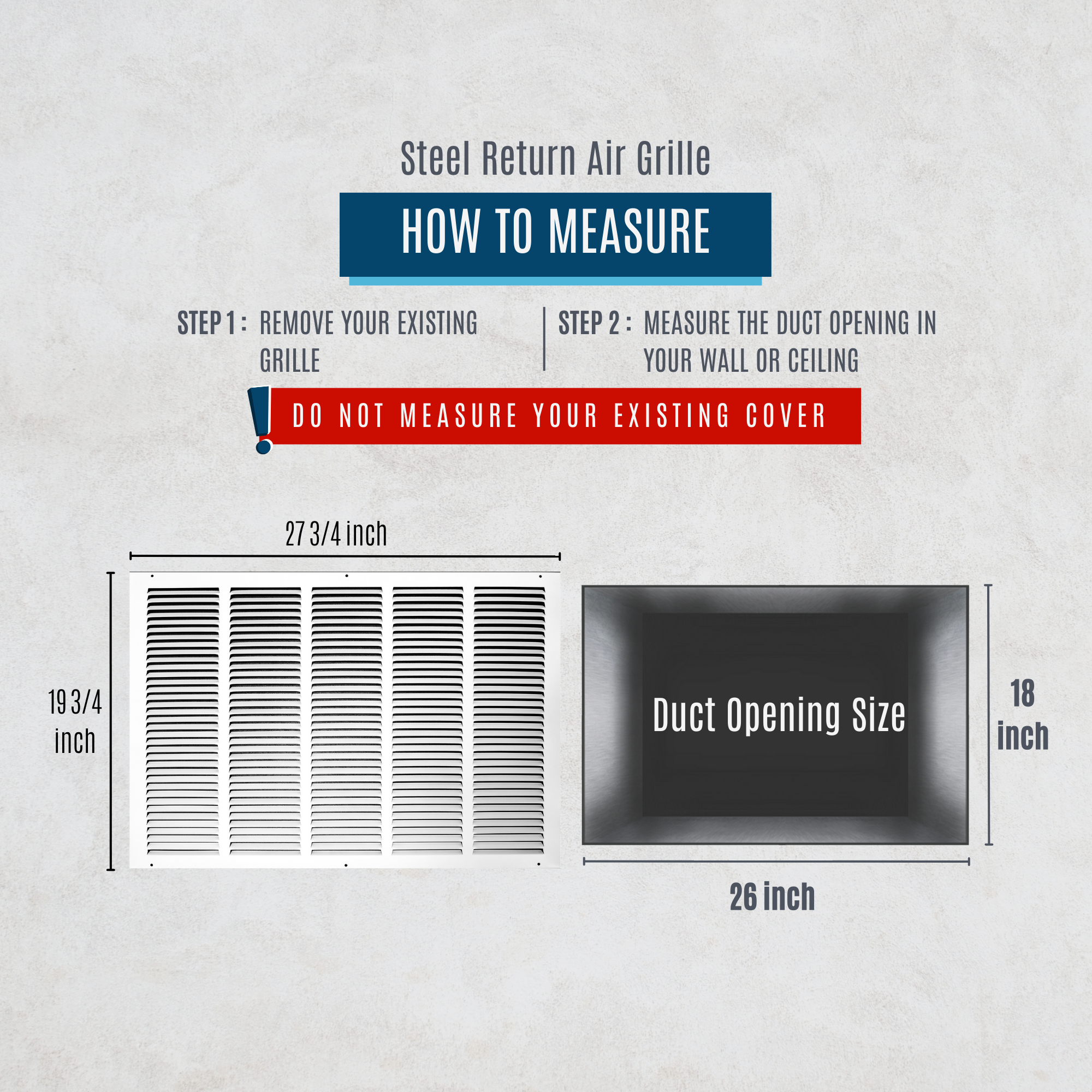 Always measure the size of the duct opening (the "hole" in the duct/wall). Do not measure the entire size of the register itself. Size of the grille is; listed size +1.75-inch.