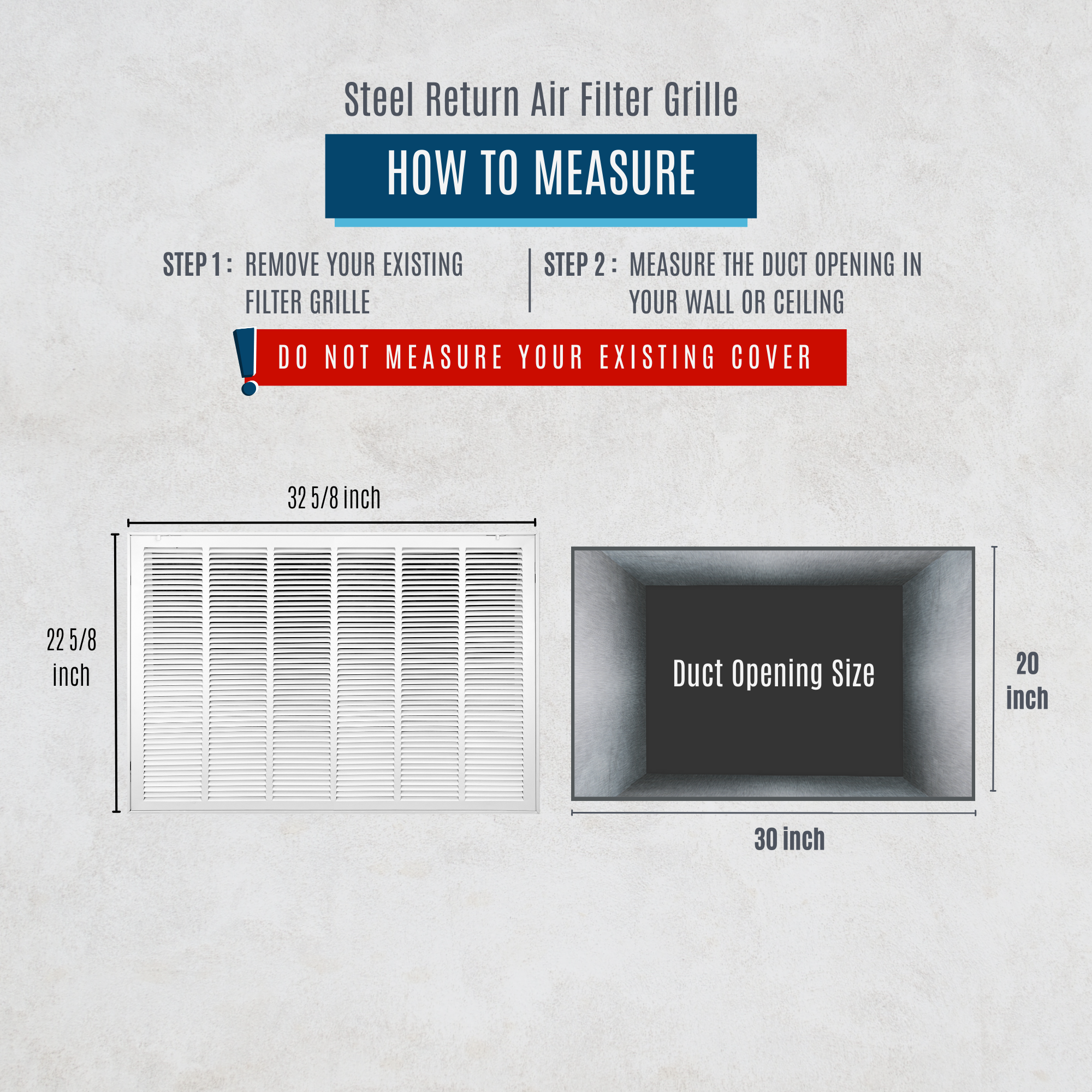 Always measure the size of the duct opening (the "hole" in the duct/wall). Do not measure the entire size of the register itself. Each grille has a front face frame, that will overlay at wall joint. Entire outer size of the grille is; listed size +2 5/8-inch.