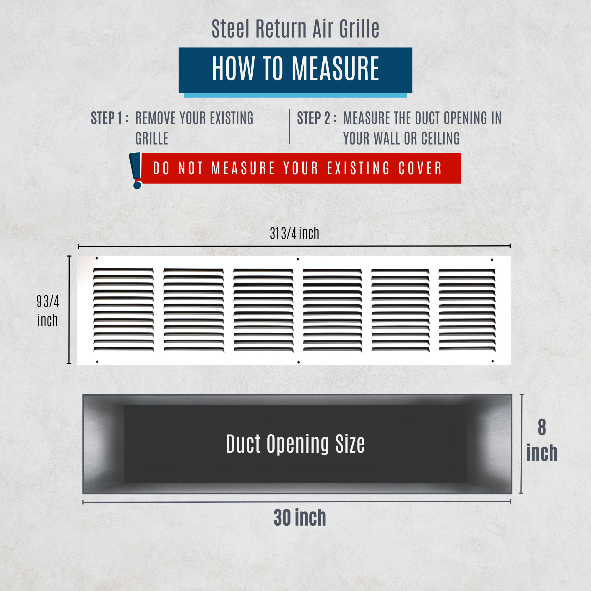 Always measure the size of the duct opening (the "hole" in the duct/wall). Do not measure the entire size of the register itself. Size of the grille is; listed size +1.75-inch.